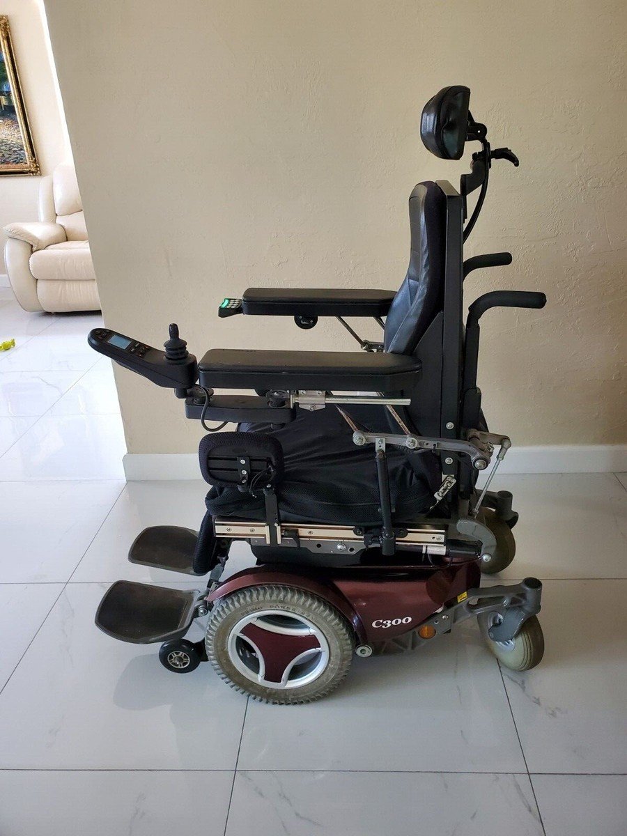 The Permobil C300 electric wheelchair is a front-wheel drive power chair known for its maneuverability and customization options, including power tilt, recline, and elevating leg rests. It has a maximum speed of 5 mph and a weight capacity of 265 lbs. The base dimensions are typically 24.25″ wide and 43″ long, but can vary slightly based on configurations.