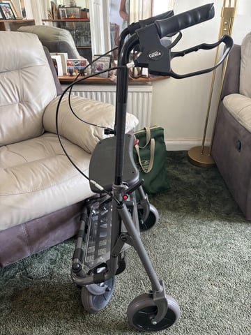 Almost new mobility walker with seat and tray . Been used a little within the house but still on great condition . Has storage compartment . Ford through internal home doors . Has brakes