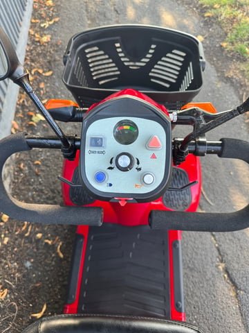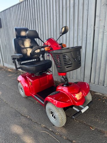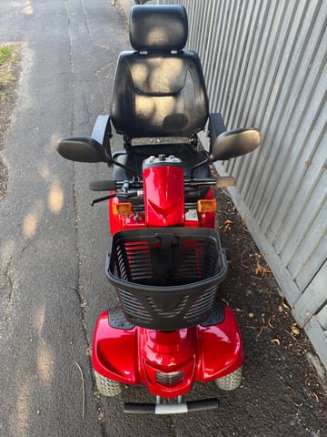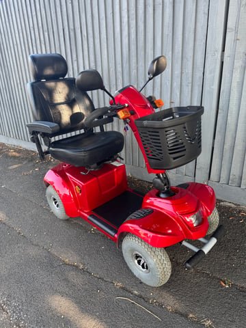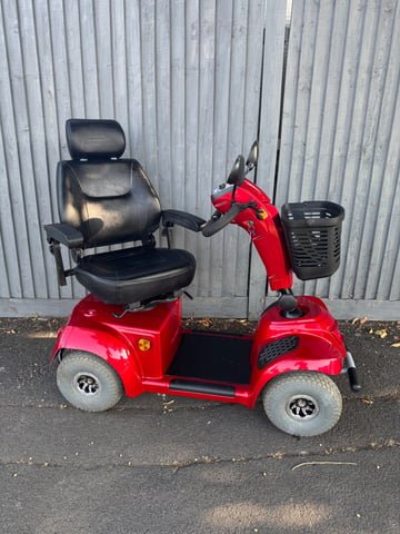 This adaptable scooter is perfect for both roads and pavements. It reaches speeds of up to 8mph for covering long distances quickly, and with a simple switch, you can reduce the speed to 4mph for safe navigation in pedestrian areas or shops. Designed for comfort, it features front suspension, pneumatic tires, and a well-padded, adjustable captain’s seat.